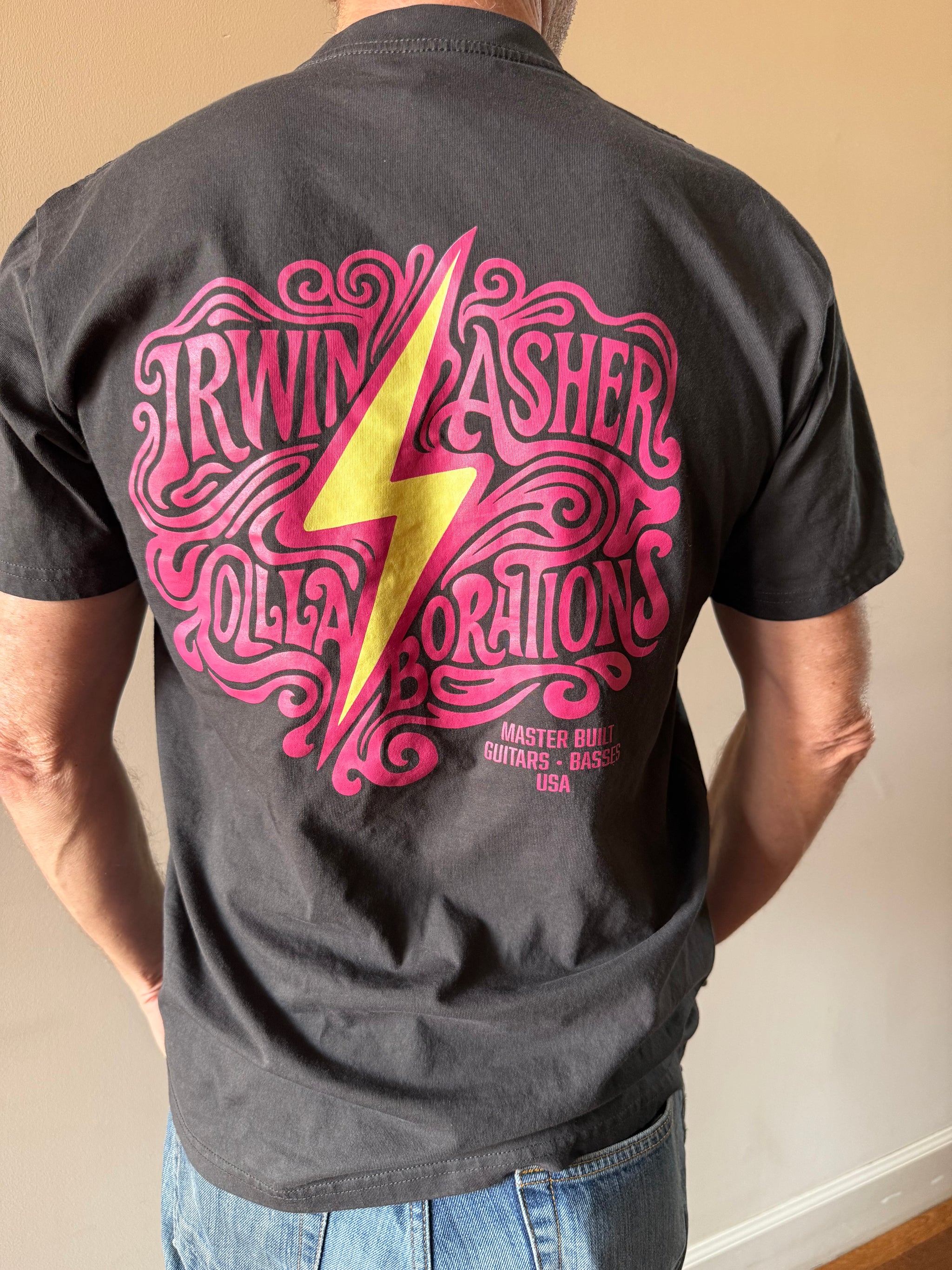 The Official Asher Irwin Collaborations Classic T celebrates the partnership between master guitar builders Bill Asher and Doug Irwin. Honoring the iconic guitars made famous by Jerry Garcia, this collaboration blends classic craftsmanship with new designs inspired by the era. It’s a tribute to legendary tone, timeless style, and the spirit of innovation.